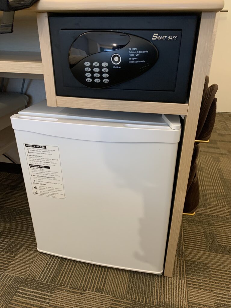 침대는 더블로 구성되어 있고, 화장실, 화장대 겸 탁자, 냉장고, 드라이기, 금고등이 있네요