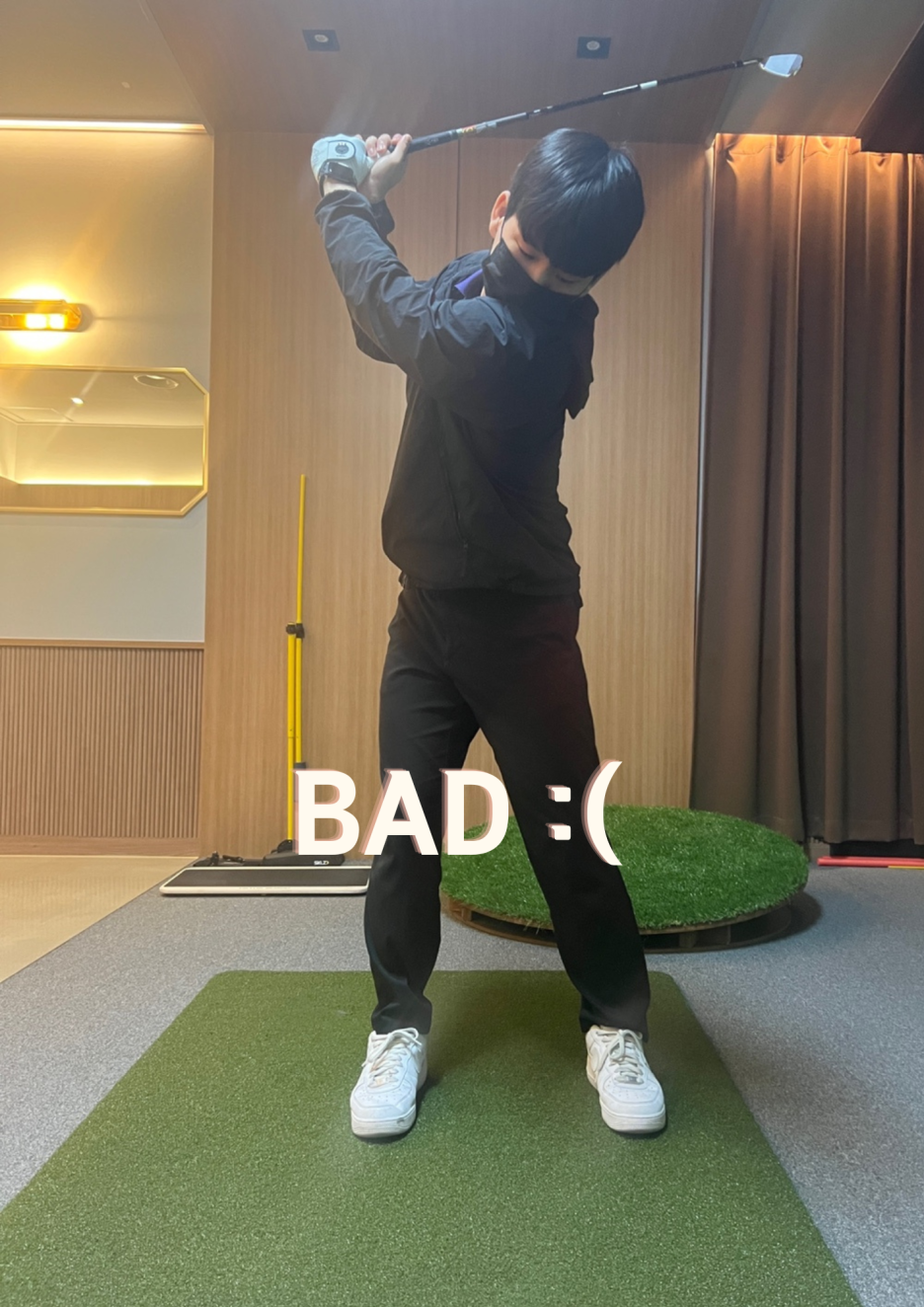 백스윙 탑에 도달했을 때는 내 코가 공보다 오른쪽을 본다는 느낌으로 약간 돌아가야 합니다.