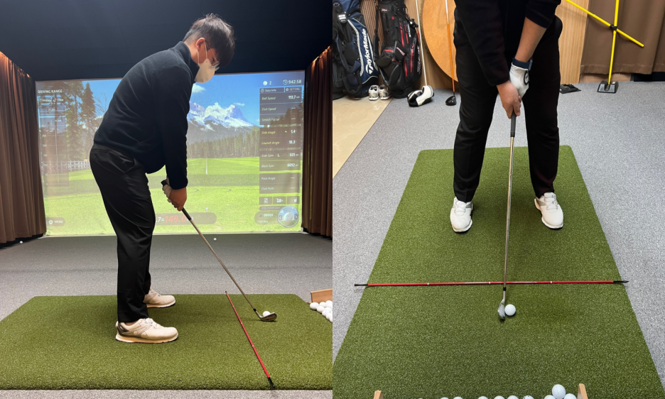 먼저 얼라인먼트 스틱을 통한 교정 방법이 있는데요. 올바른 위치에 공을 놓고 그 밑에 일자로 스틱을 놓습니다.