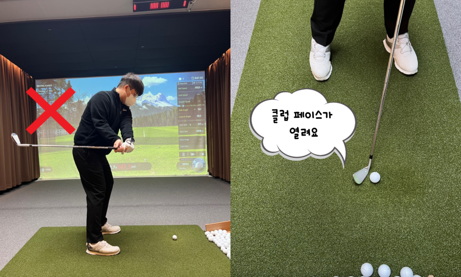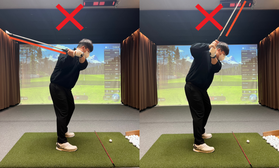 채를 너무 눕히거나 치켜세우게 되면 그립 끝이 공을 가리키지 못하게 되고 올바른 백스윙을 할 수 없게 되므로 이 부분도 다음과 같은 모양이 나오지 않도록 주의해 주세요!