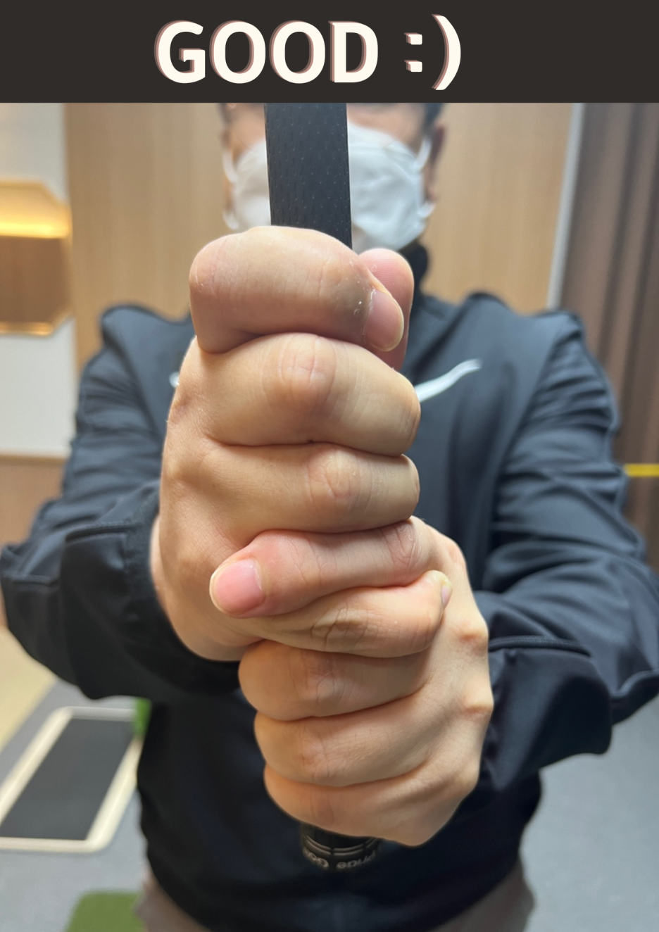 주의하실점은 오른손이 앞으로 나오며 검지보다 위쪽으로 잡히는 텐핑거 그립이 되지 않게 잡으셔야 합니다.