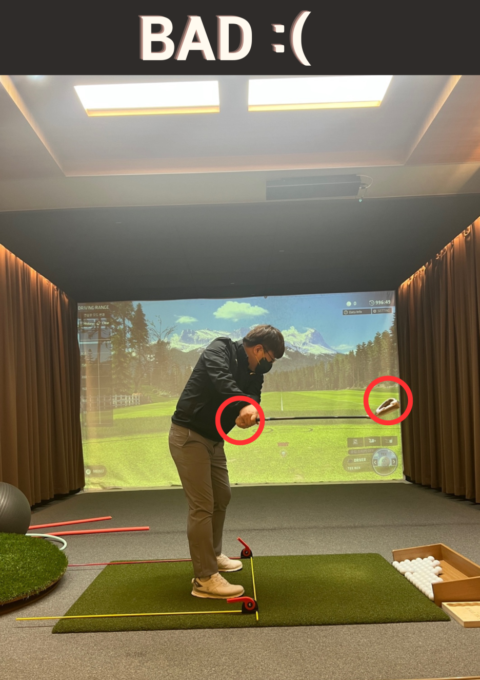 샤프트가 지면과 평행이 되는 높이에서 클럽헤드가 손보다 뒤로 가는 경우가 제일 흔한데요.